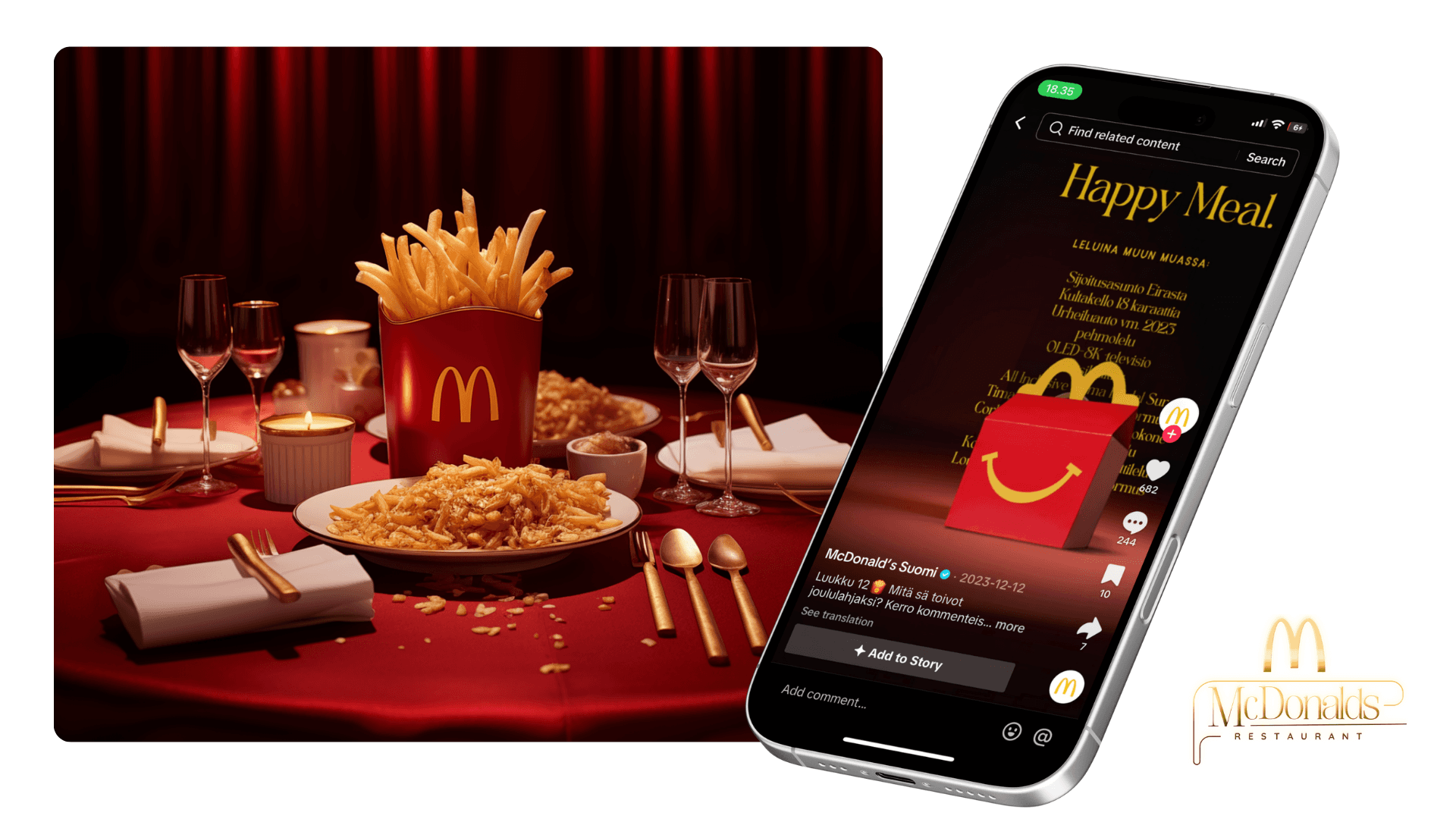 Maailman suurimmalle ravintolaketjulle toteutettiin uudenlainen konsepti osana Suomen joulukalenterikampanjaan. Videokonseptin aiheena oli: Miltä McDonald’s näyttäisi luksusbrändinä. Tarkoituksena oli herättää huomiota, tuoda mukaan yllätyksellisyyttä ja rakentaa brändiin uudenlaista visuaalista kerroksellisuutta ja huumoria – kuitenkaan McDonald’sin tunnistettavuutta kadottamatta.