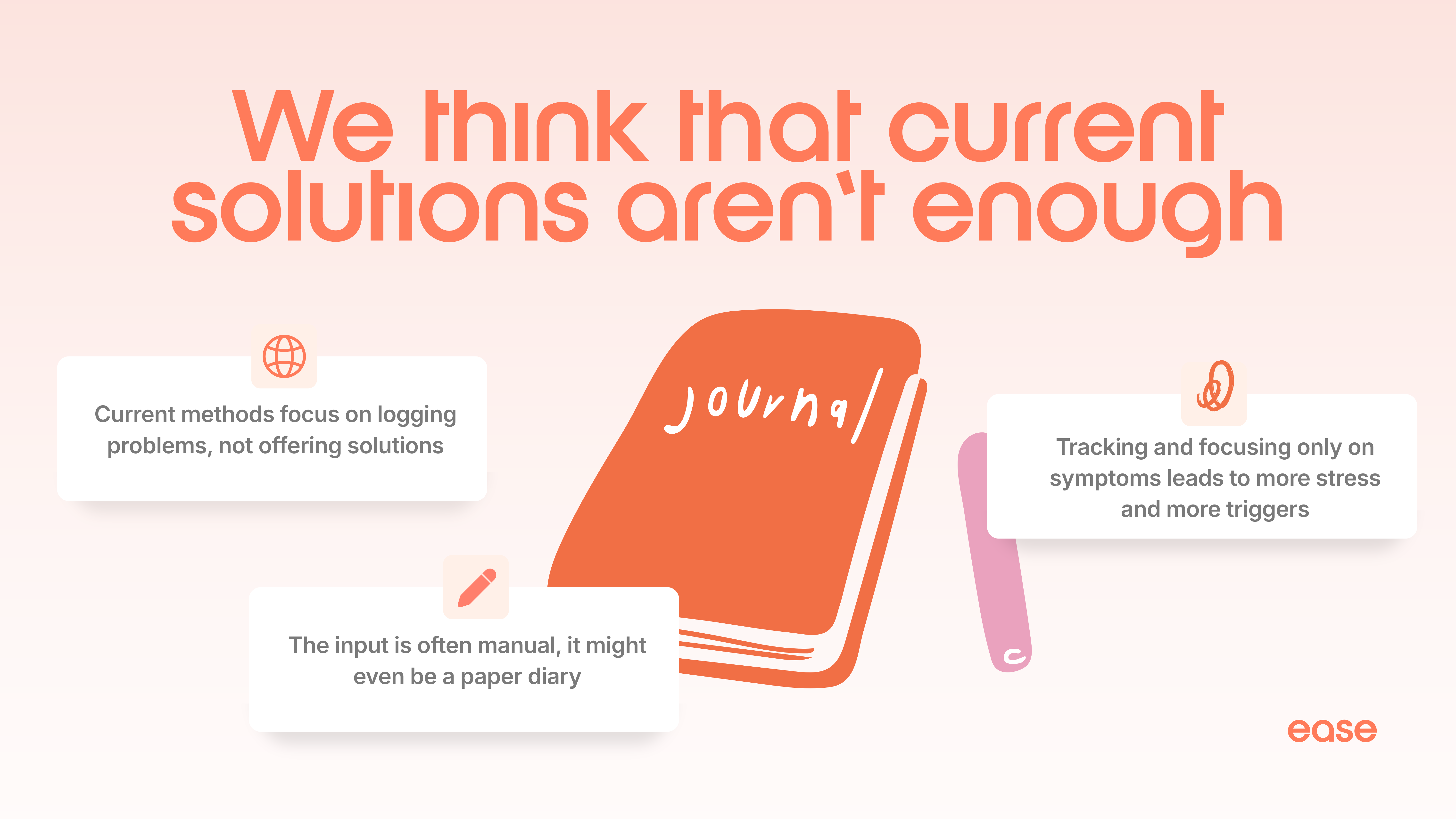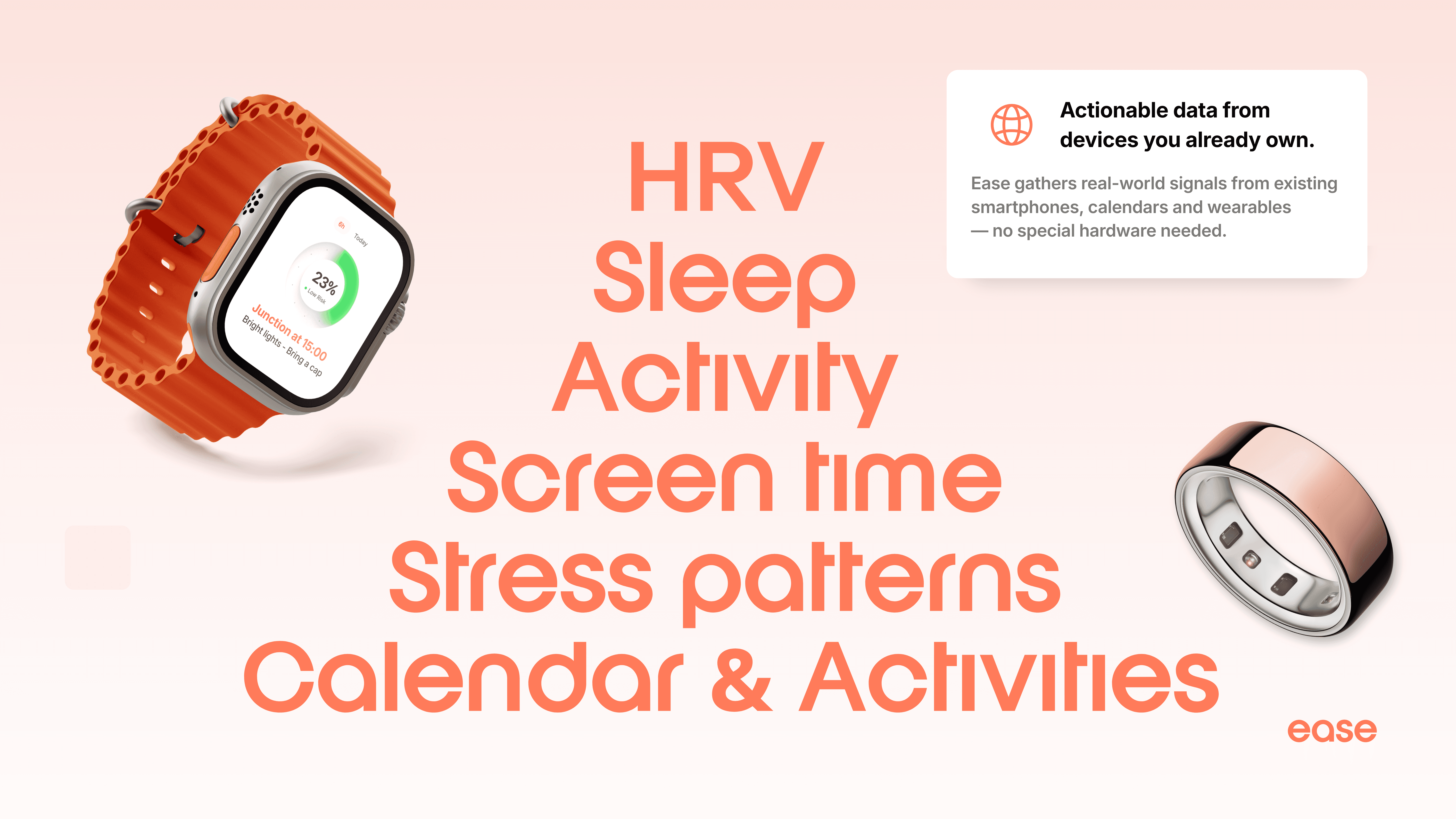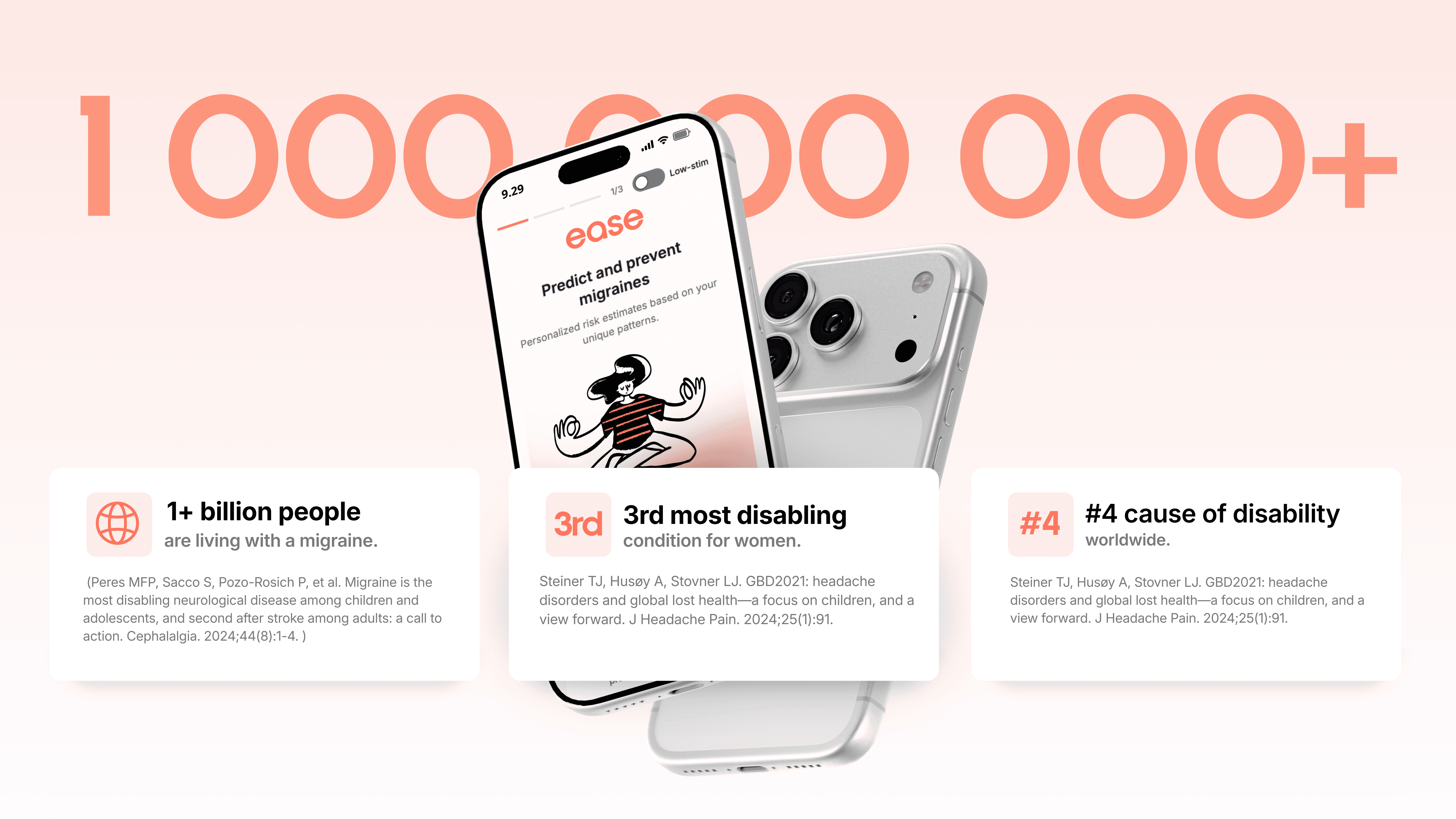 Suunnittelin Ease-sovelluksen käyttöliittymän selkeäksi, rauhalliseksi ja migreenistä kärsivien käyttäjien tarpeita tukevaksi. Värimaailma, typografia ja vuorovaikutukset rakennettiin vähentämään kuormitusta, helpottamaan datan hahmottamista ja tukemaan sovelluksen ennakoivia toimintoja.