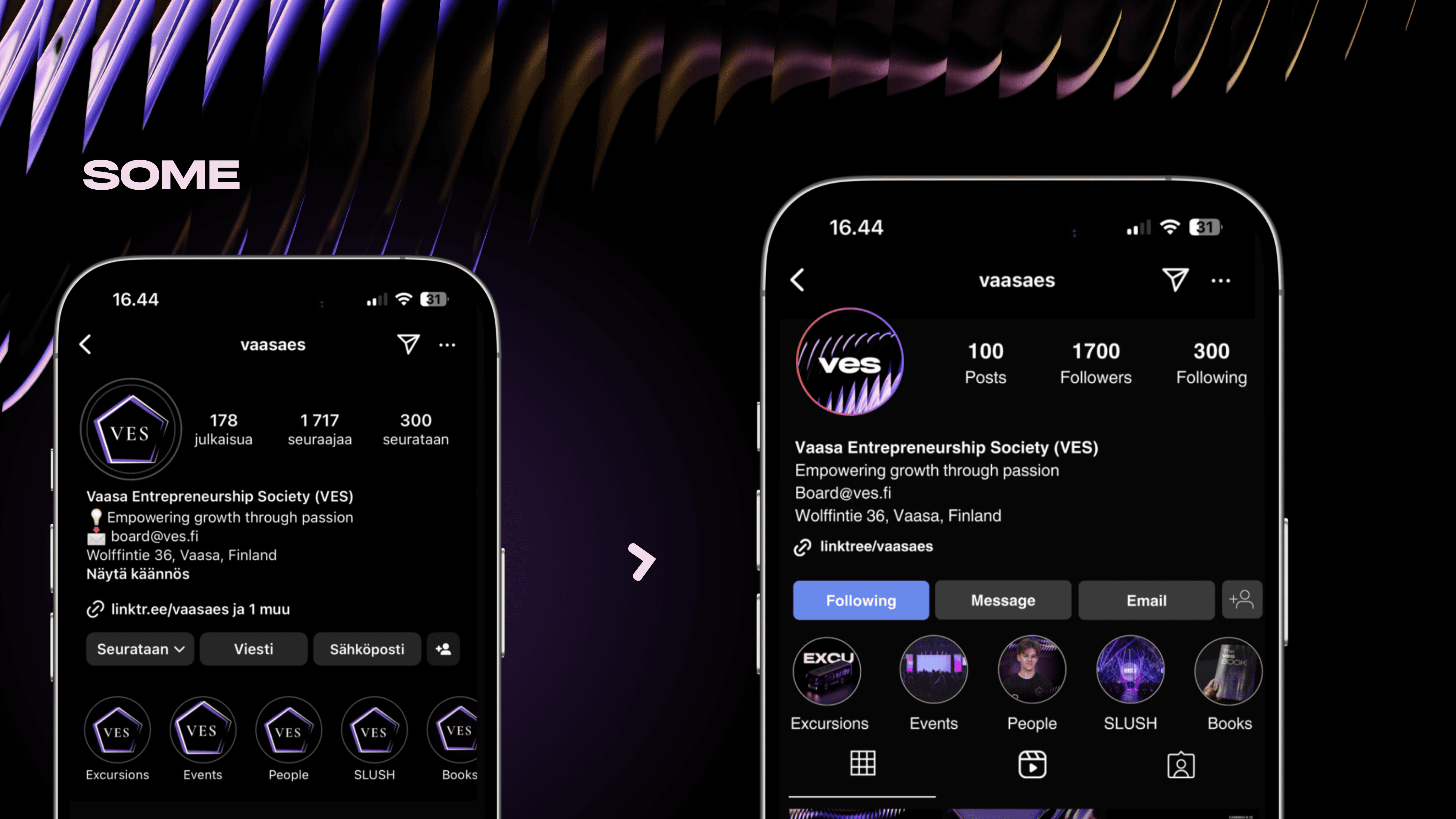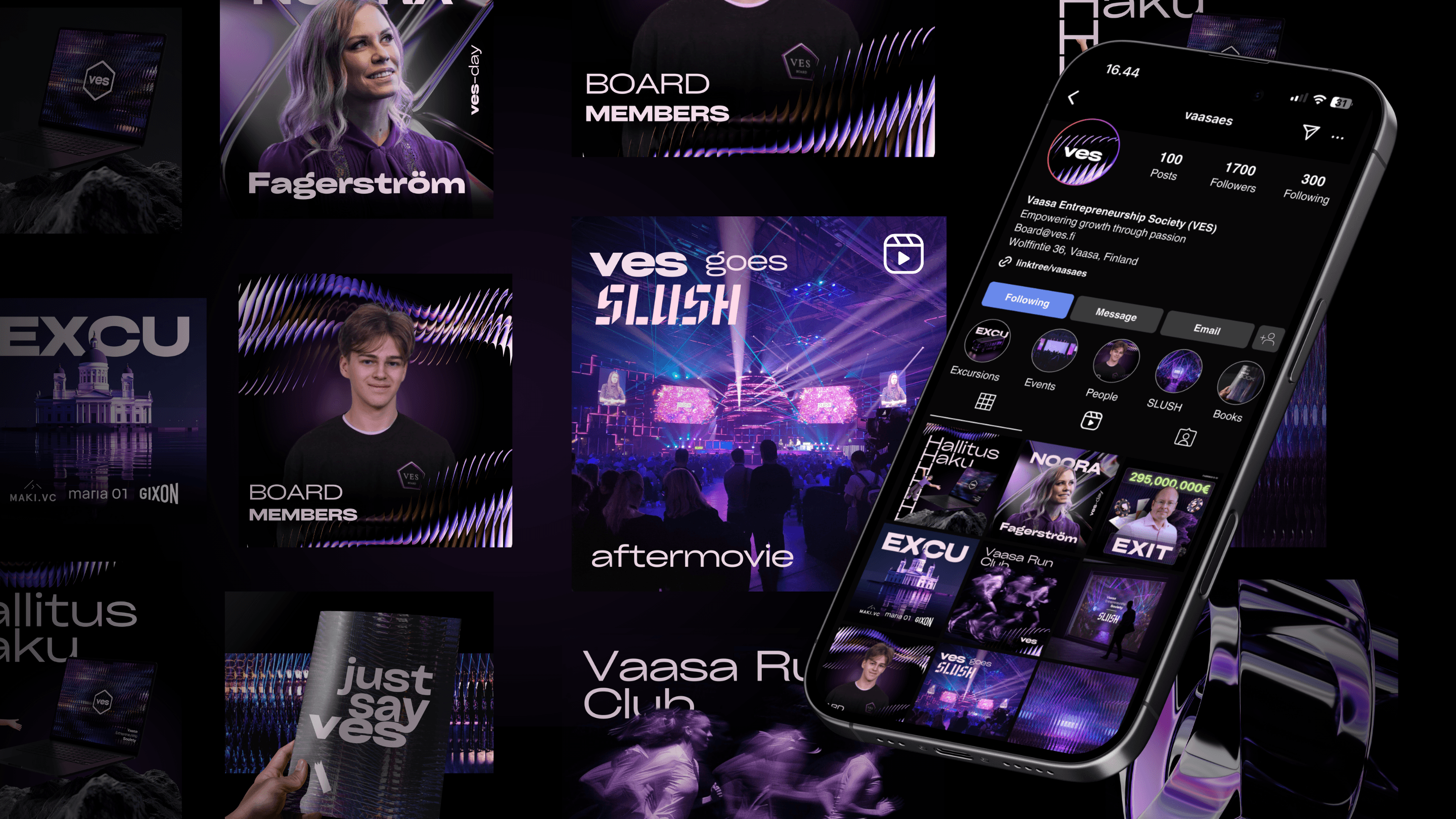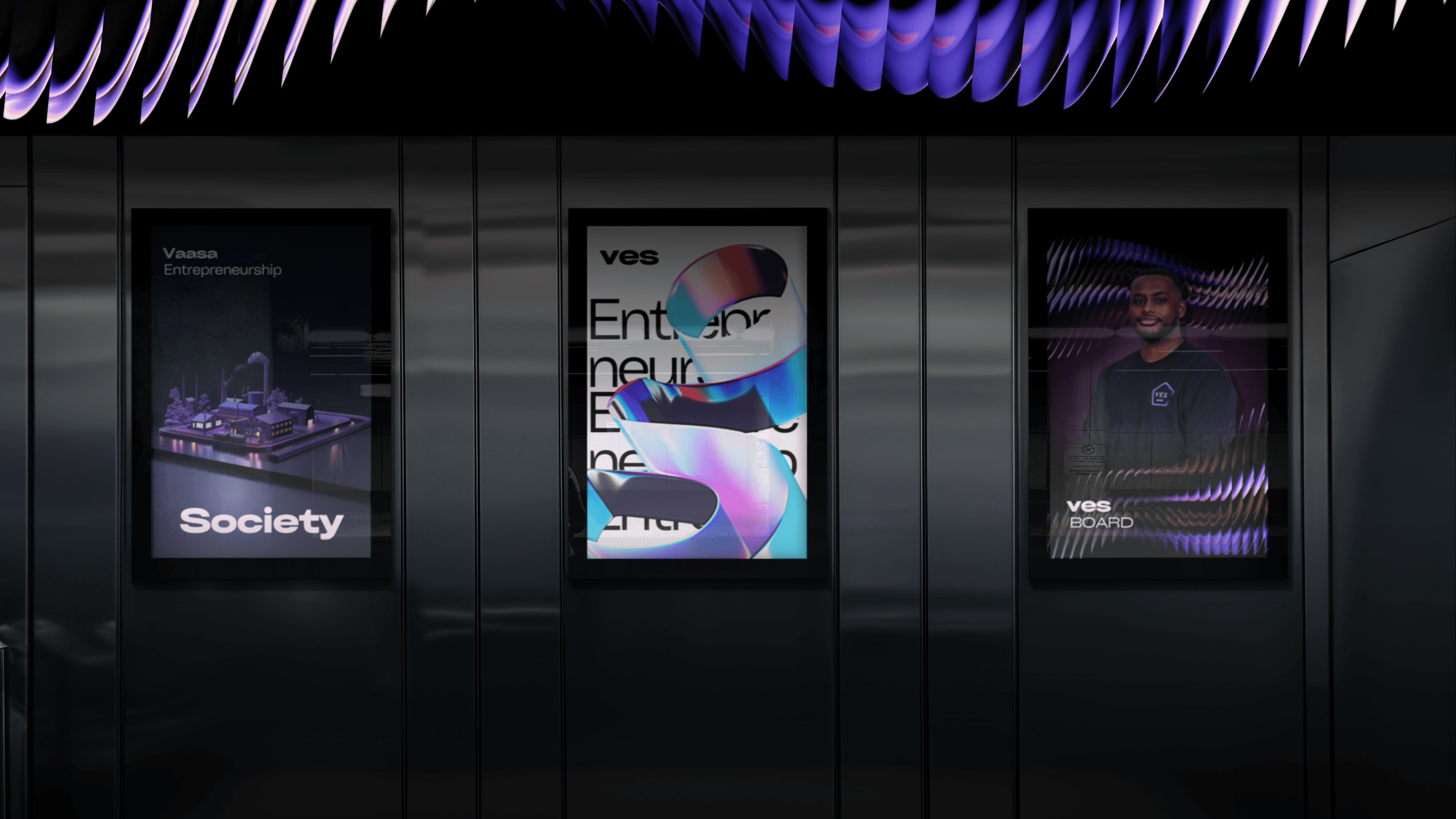 Vaasa Entrepreneurship Society on opiskelijavetoinen yhteisö, joka edistää yrittäjyyttä Vaasassa. Uudessa ilmeessä yhdistyvät moderni rakenne, abstraktit muodot ja elävä pinta, jotka tekevät kokonaisuudesta tunnistettavan ja uniikin. Väripaletin rinnalle tuotiin graafisia yksityiskohtia, jotka lisäävät visuaalisuuteen energiaa. Ilme on helposti sovellettavissa eri alustoille ja auttaa rakentamaan yhtenäistä ja tunnistettavaa ilmettä erityisesti digitaalisessa viestinnässä.